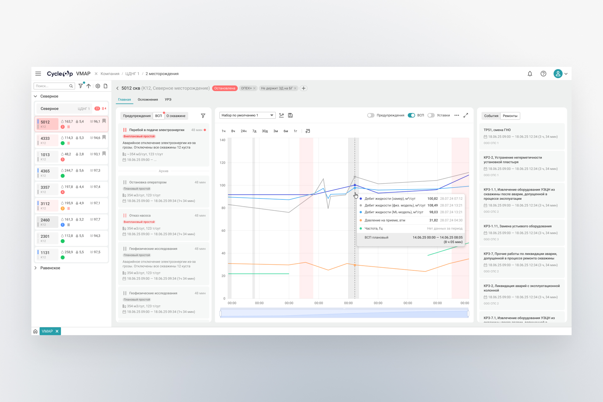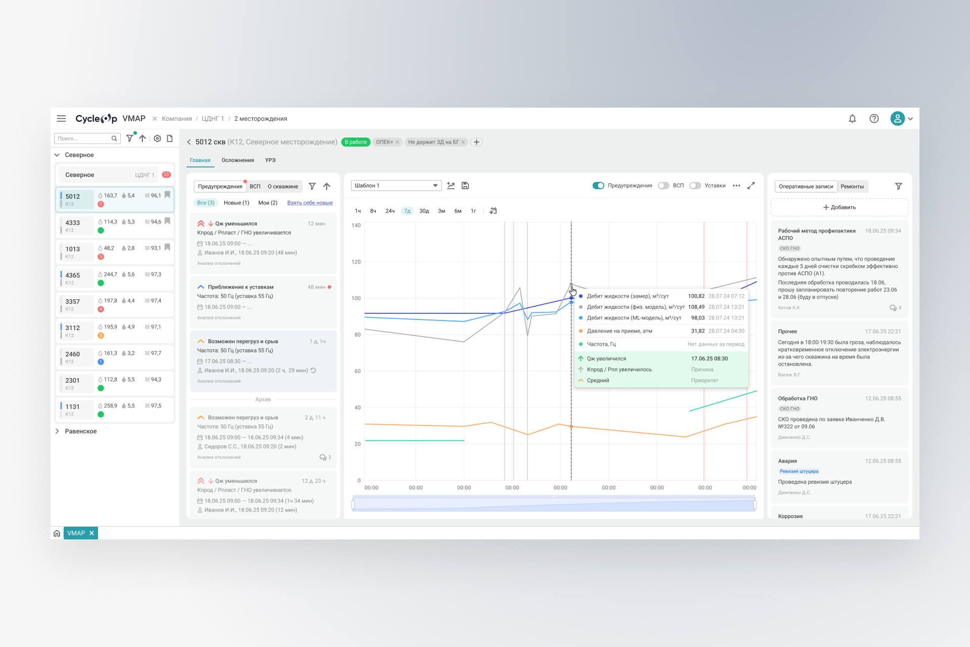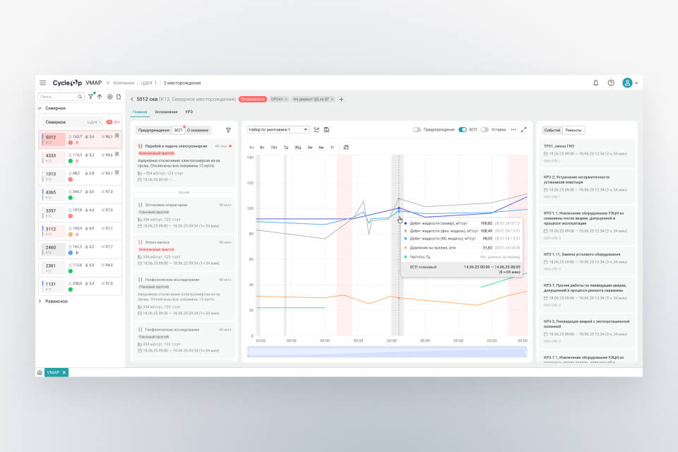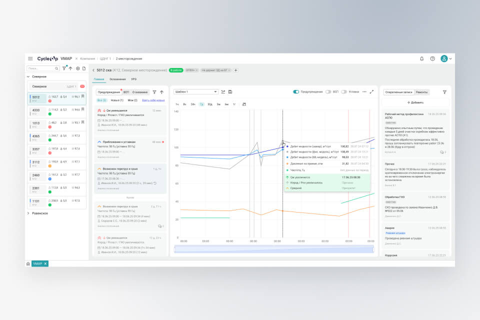 CycleOp VMAP позволяет отслеживать работу скважин и оборудования в реальном времени, выявляя отклонения ещё до наступления аварийных ситуаций.